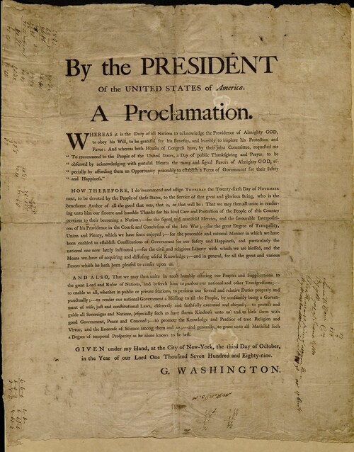 NOW THEREFORE I do recommend and assign Thursday the 26th day of November next to be devoted by the People of these States to the service of that great and glorious Being, who is the beneficent Author of all the good that was, that is, or that will be—That we may then all unite in rendering unto him our sincere and humble thanks—for his kind care and protection of the People of this Country previous to their becoming a Nation—for the signal and manifold mercies, and the favorable interpositions of his Providence which we experienced in the course and conclusion of the late war—for the great degree of tranquillity, union, and plenty, which we have since enjoyed—for the peaceable and rational manner, in which we have been enabled to establish constitutions of government for our safety and happiness, and particularly the national One now lately instituted—for the civil and religious liberty with which we are blessed; and the means we have of acquiring and diffusing useful knowledge; and in general for all the great and various favors which he hath been pleased to confer upon us.